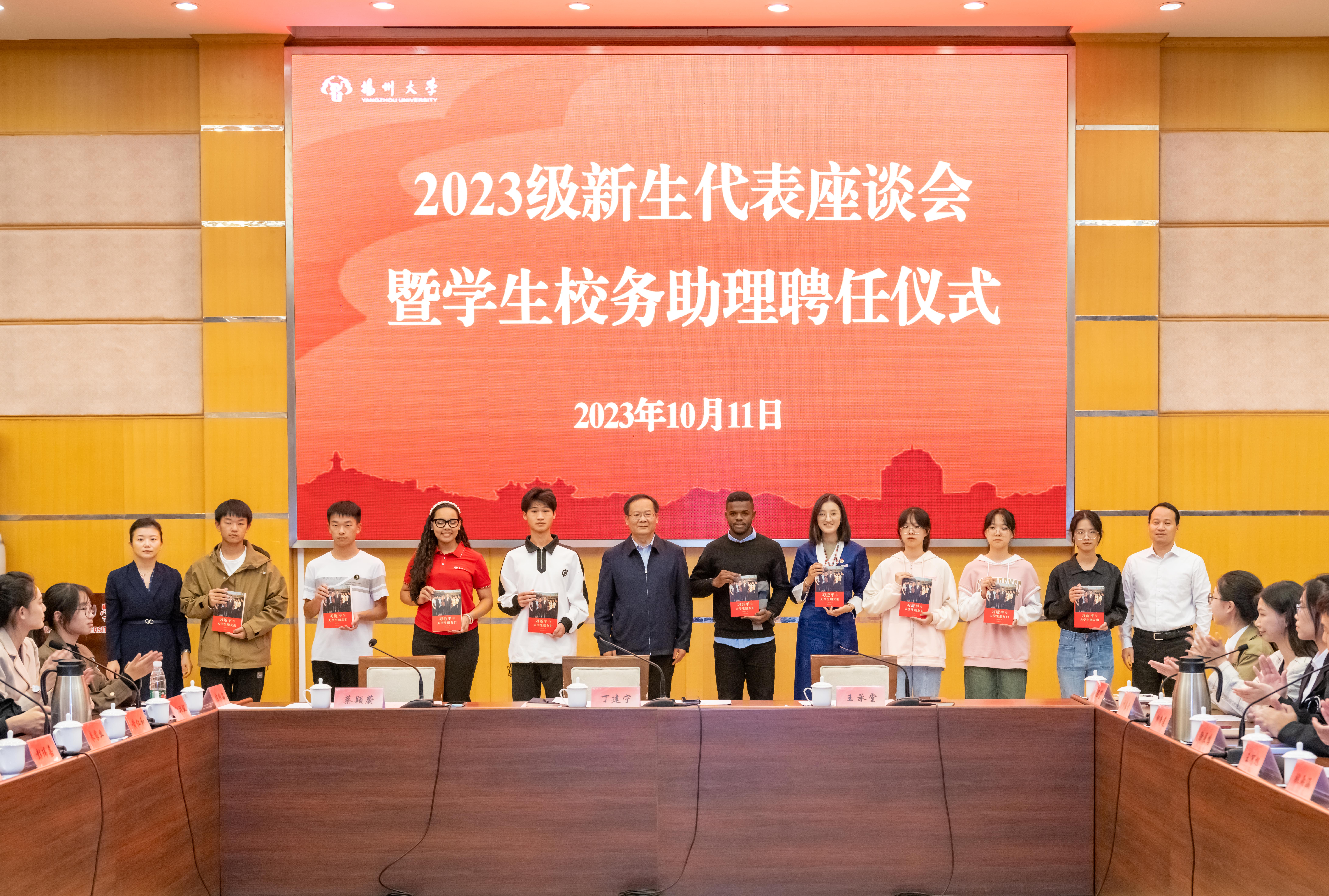 10月11日,学校在荷花池校区教学主楼举行2023级新生代表座谈会暨学生校务助理聘任仪式。校长丁建宁、副校长王承堂出席活动,副校长蔡颖蔚主持活动。