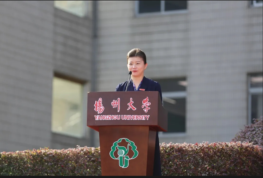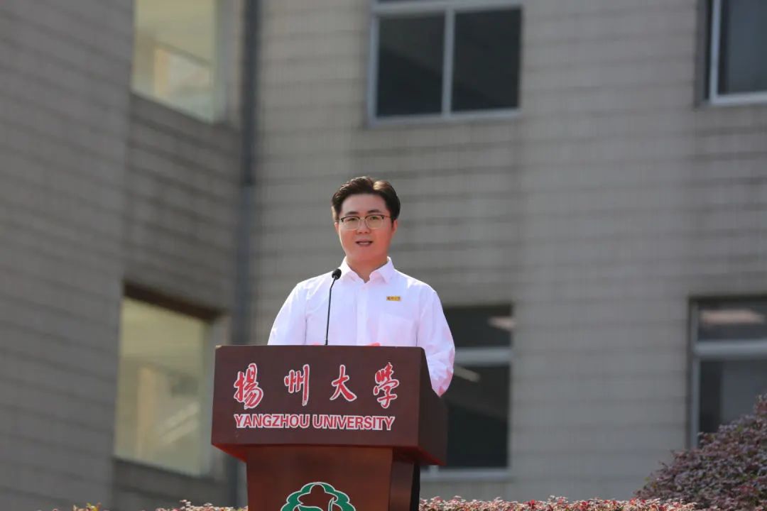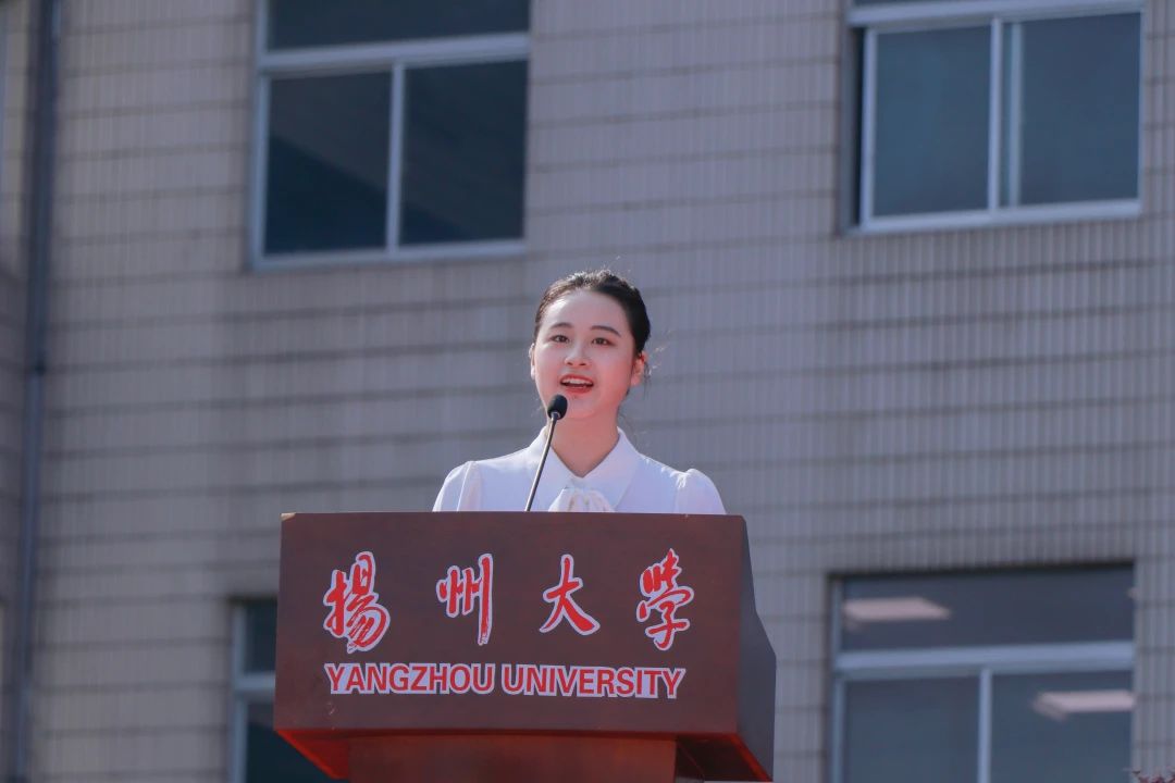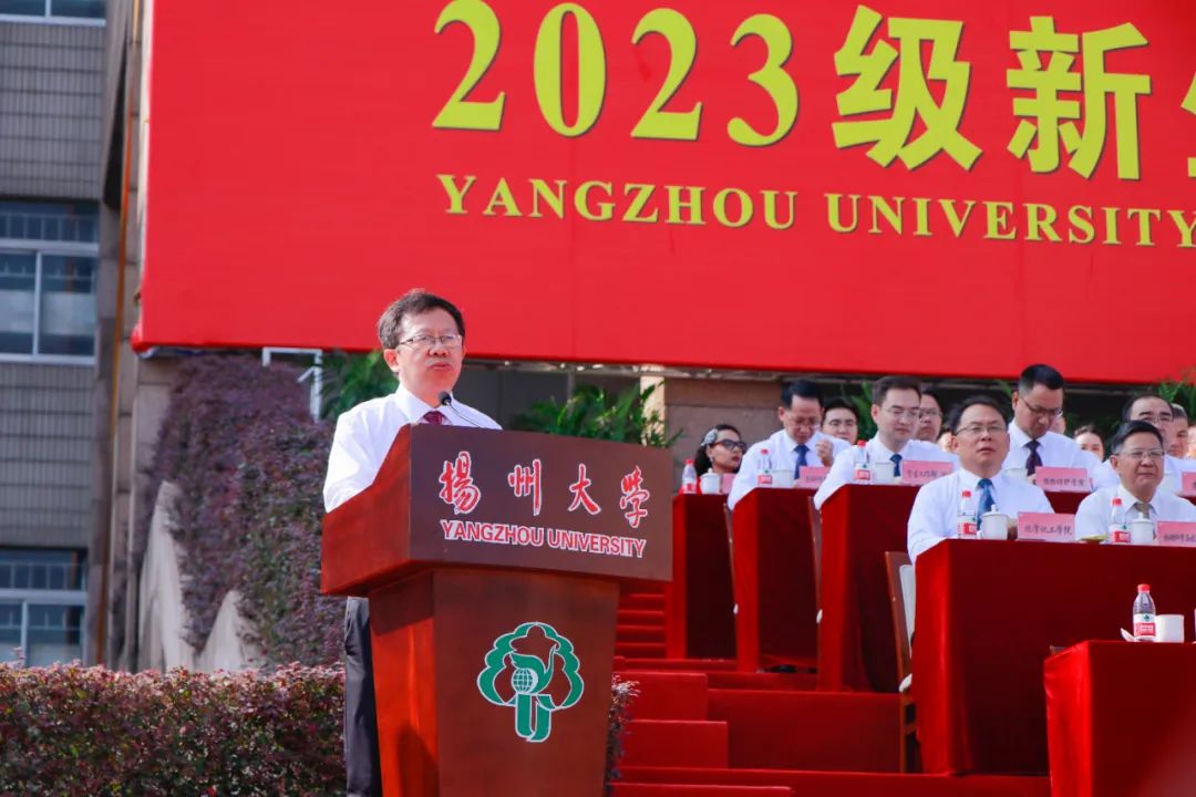 校友代表、第八届鲁迅文学奖获得者庞余亮深情回顾了在校求学经历,他勉励全体新同学怀有一颗积极向上的心,树立远大理想,不断超越自我,努力成长为参天大树。教师代表、中国工程院院士、农学院教授张洪程希望全体新生胸怀世界,心系党和国家;勤奋学习,养成良好习惯;躬耕实践、弘扬创新精神,成为祖国的栋梁之才,写就大学时代的美好和精彩。老生代表、数学科学学院王梦杰号召学弟学妹们为学校谱写高水平研究型大学现代化建设新篇章贡献青春力量。本科生新生代表、医学院孙路翔表示,要笃志弘毅,披荆斩棘,奋楫扬帆,不负时代。研究生新生代表、外国语学院何泊稼深情回顾了在扬大的求学之路,并表示将以奋斗之姿跑出青春加速度和最好成绩。国际学生新生代表、旅游烹饪学院巴西籍学生卫敏表示,文化的碰撞让自己看到了更广阔的天地,未来将追逐更大梦想。
