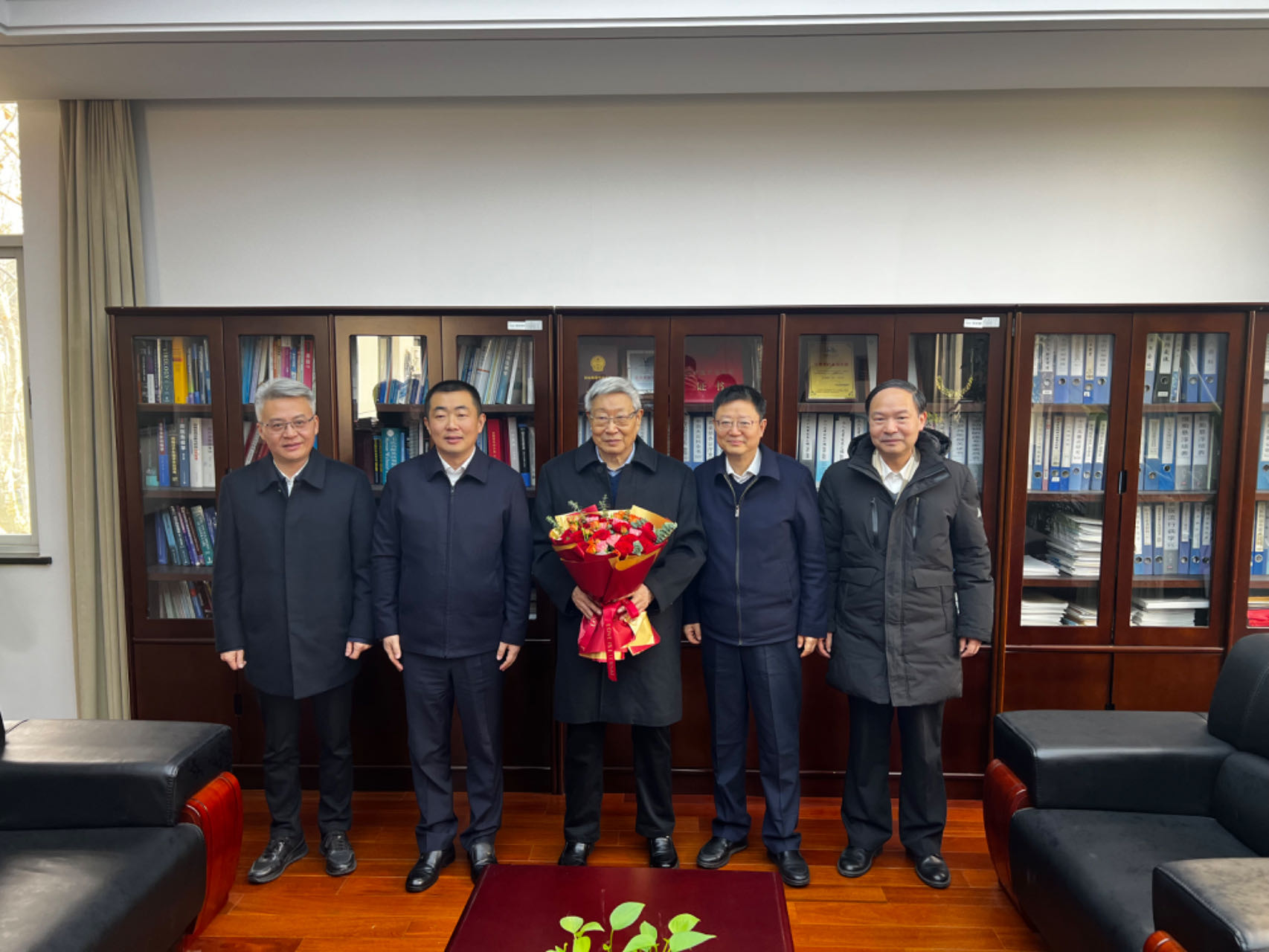 焦新安向刘秀梵送上鲜花,感谢他为学校发展付出的艰辛努力和作出的突出贡献,并围绕学校事业发展和兽医学一流学科建设进行了深入交流。