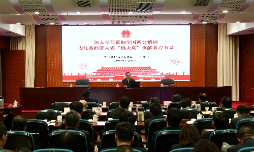 丁建宁介绍了十四届全国人大三次会议概况,传达了习近平总书记在参加江苏代表团审议时的重要讲话精神,重点介绍了政府工作报告中关于一体推进教育科技人才的相关部署和安排。丁建宁结合履职情况谈及参会感受。他强调,教育服务国家重大战略,既是时代担当更是时代机遇。战略所指,就是教育所向。无论是教育“四为服务”还是“四个面向”,只有服务好“国之大者”,才能彰显教育的基础性、战略性支撑地位。江苏高校在服务长江经济带和长三角一体化发展等战略上一直走在全国前列,也因此成就了一批一流学科。江苏目前正在牵头编制《长三角一体化教育事业发展规划》,探索跨省域的中职招生和中高职贯通式培养,这些做法就是对总书记“走在前”要求的生动践行。丁建宁向全省教育系统发出号召,要深入学习贯彻习近平总书记关于教育的重要论述和全国两会精神,以挑大梁的担当和魄力,奋力开创教育事业新局面,为教育强省、教育强国建设贡献更大力量。