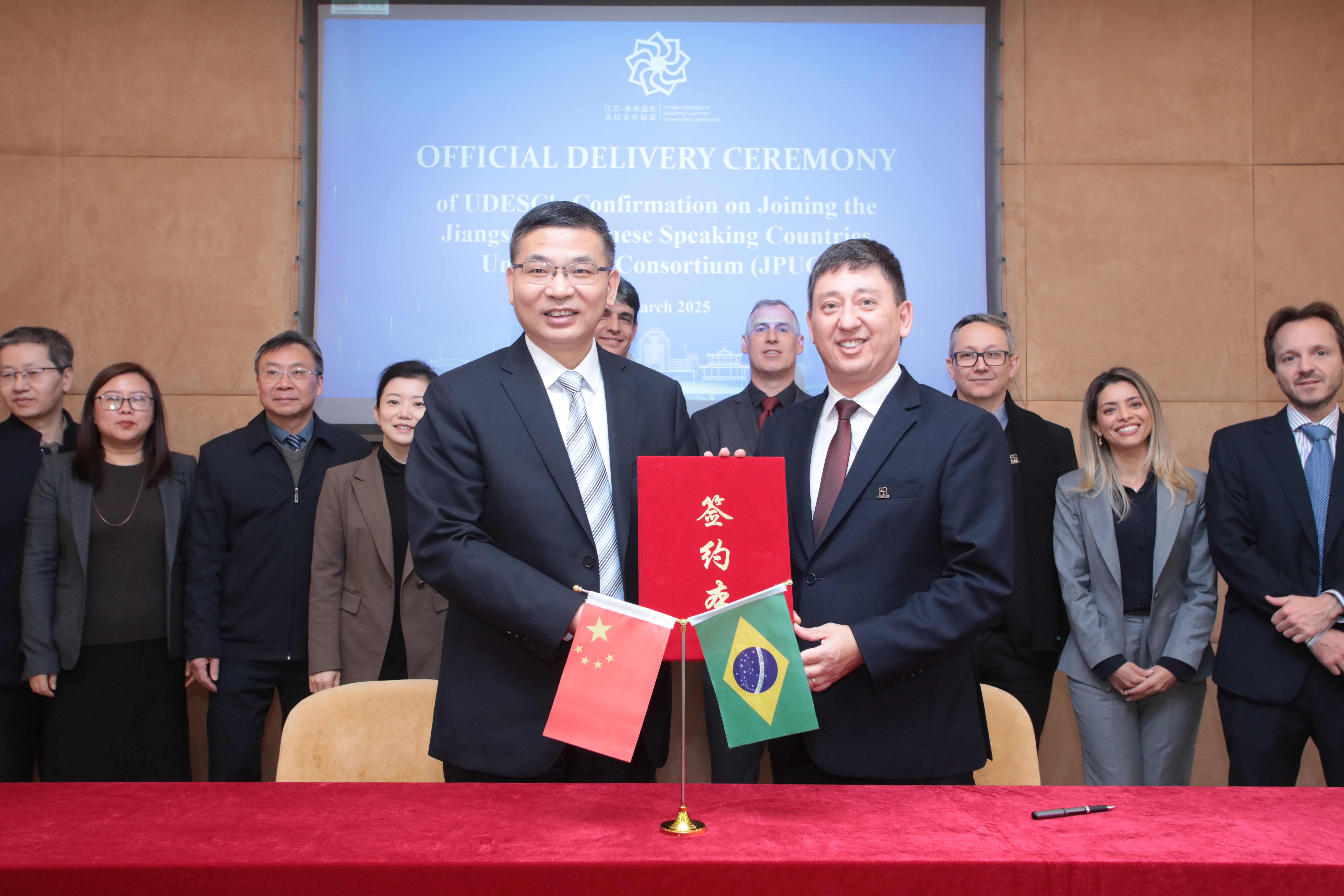 会见期间,佩兹金代表圣卡塔琳娜州立大学向刘巧泉递交了加入江苏-葡语国家高校合作联盟的确认函,蔡颖蔚和佩兹金代表两校签署了校际谅解备忘录。