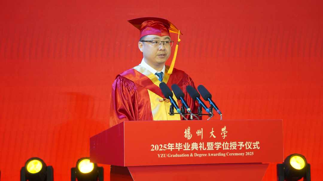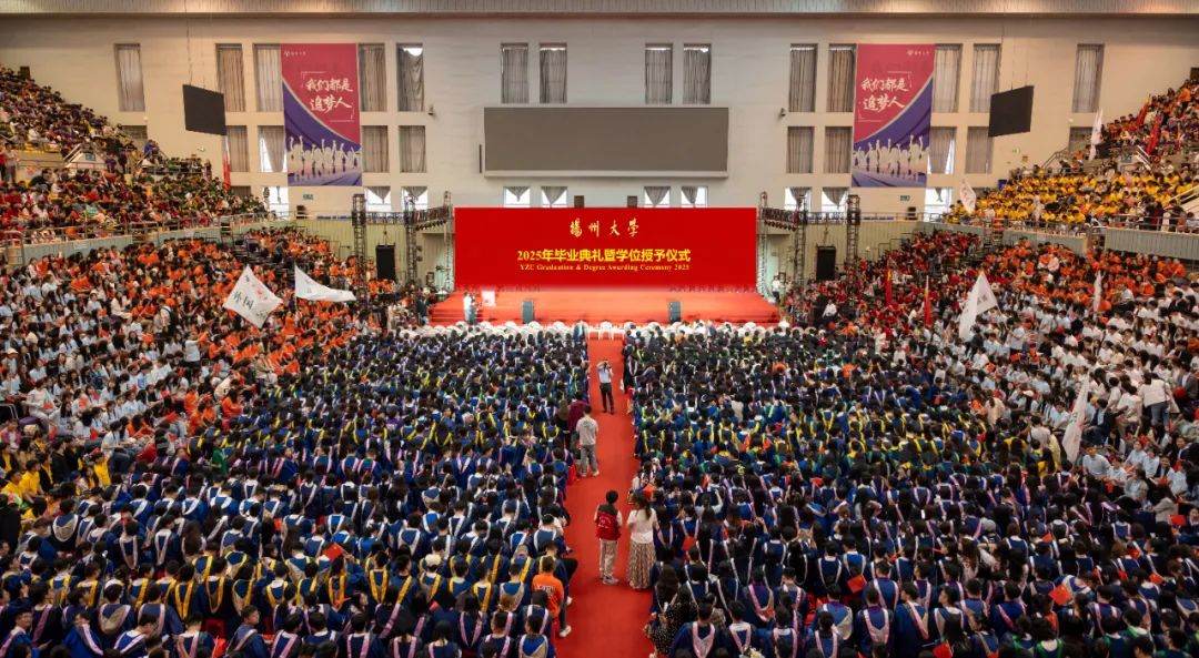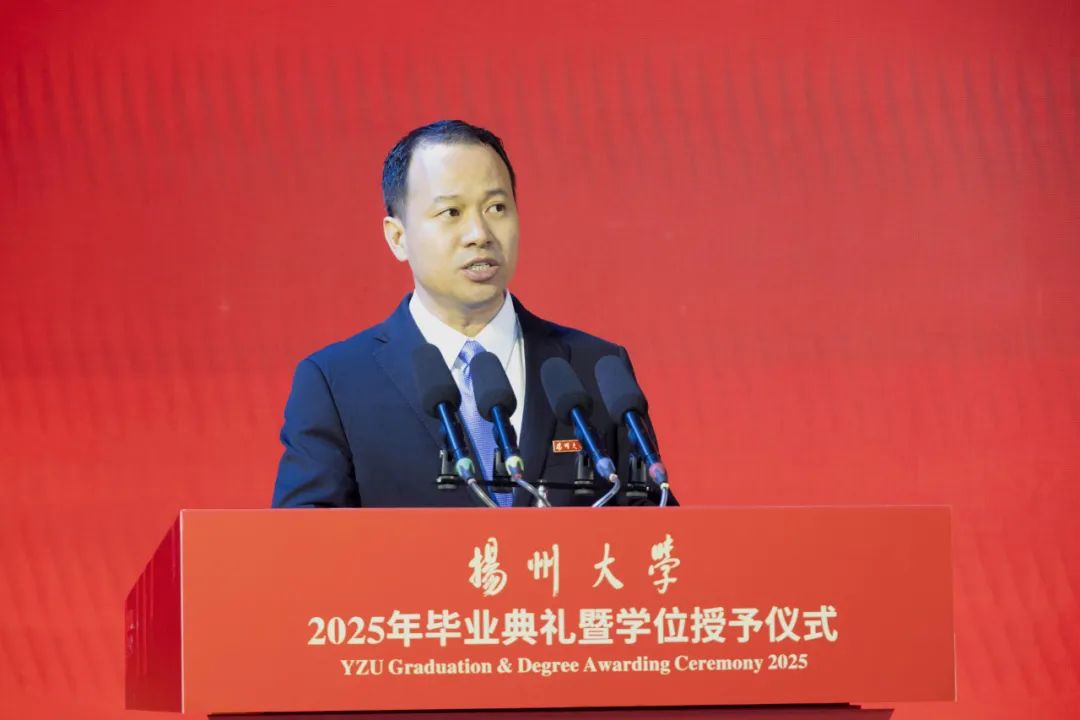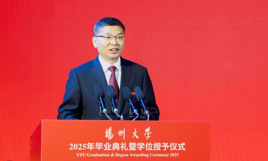 6月10日,扬州大学2025年毕业典礼暨学位授予仪式在荷花池校区体育馆举行。校党委书记丁建宁出席典礼并为优秀毕业生代表颁奖,校长刘巧泉发表讲话。周如军、蒋乃华、赵文明、龚卫娟、邱庆峰等校领导、党委常委出席典礼。副校长王承堂、韩杰分别宣读优秀毕业生表彰决定和学位授予决定。副校长蔡颖蔚主持典礼。校学位评定委员会全体委员,各学院、校机关各部门、各直属单位主要负责人,教职工代表、家长代表与12000余名毕业生欢聚一堂,共同参与、见证这一青春盛典。