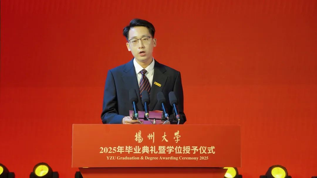 典礼上,在新闻与传媒学院毕业生代表汤子怡的带领下,1万余名毕业生右手握拳,庄严宣誓:“志存高远、明德躬行,求是求实、求新求精,坚苦自立、勇于担当,心系扬大、为国栋梁。”学校师生精心准备的诗歌朗诵《归来仍少年》及器乐表演博得了毕业生们的阵阵掌声。