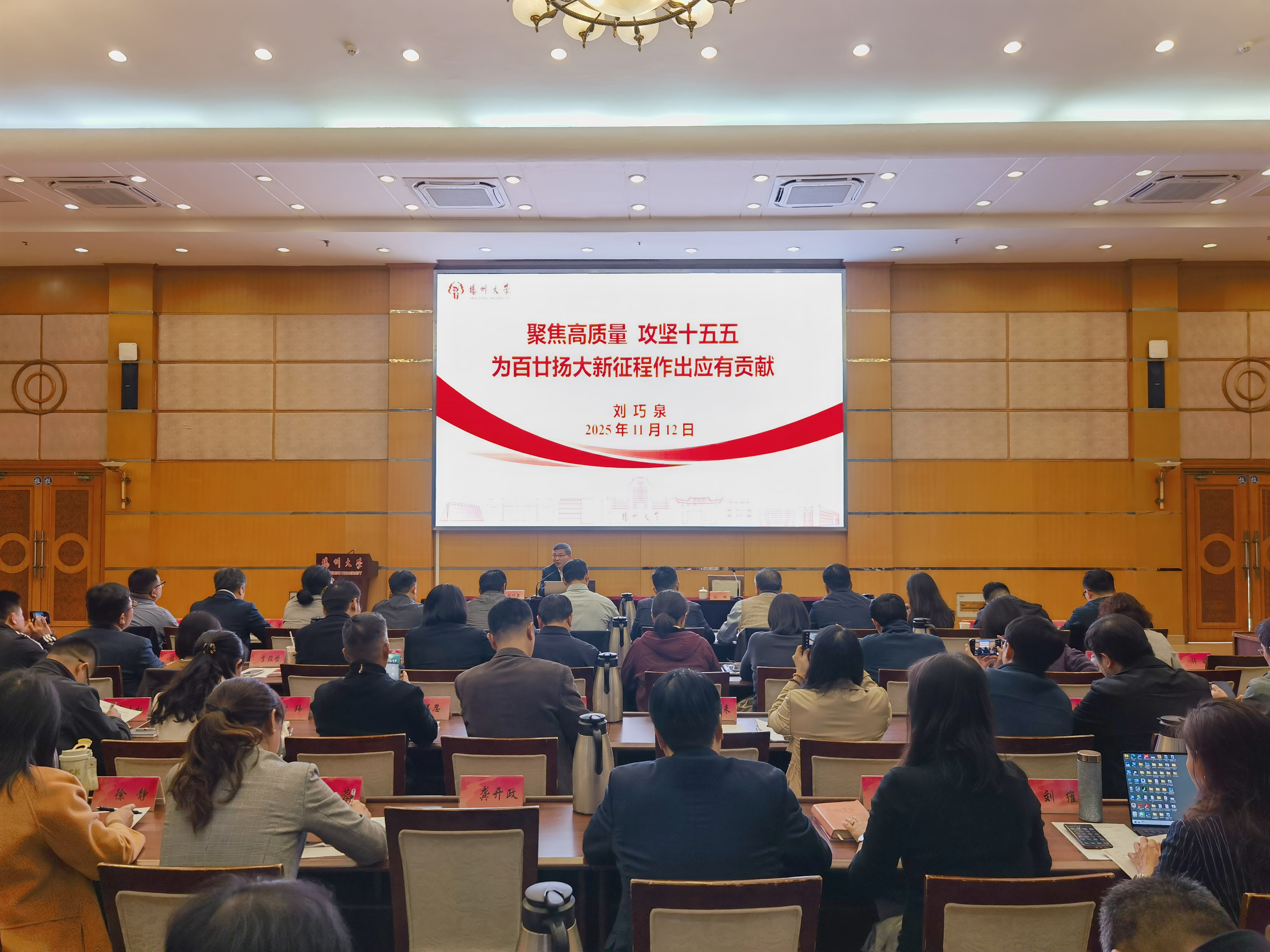 11月12日,在新提任中层干部培训班上,校长刘巧泉以《聚焦高质量攻坚“十五五” 为百廿扬大新征程作出应有贡献》为题作专题辅导报告。组织部主要负责同志主持报告会。