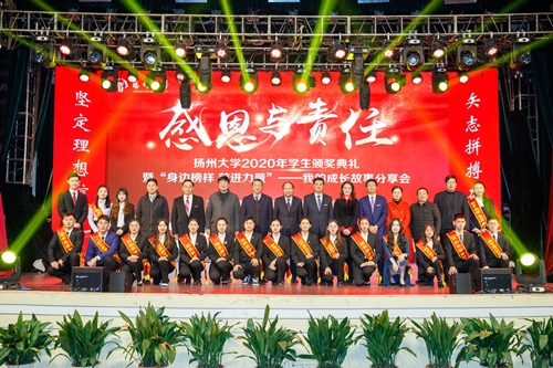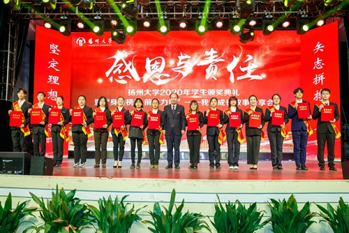 12月28日,学校在文汇路校区大礼堂隆重举行“感恩与责任”2020年学生颁奖典礼。校长焦新安,校党委副书记叶柏森,副校长陈国宏、俞洪亮等领导分别为国家奖学金、校长特别奖学金、博士研究生学术新人奖、费孝通立德奖学金、校园先锋、国家励志奖学金以及省级以上专业竞赛和荣誉称号获奖代表颁奖。