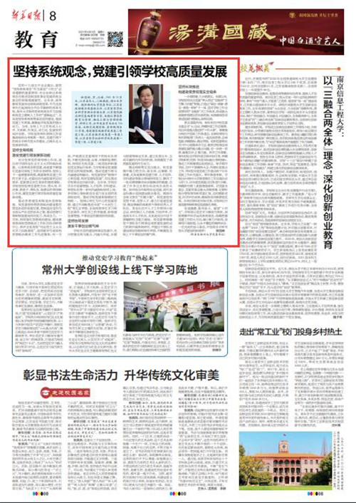 4月6日,校党委书记姚冠新在《新华日报》发表题为《坚持系统观念,构建党建引领高质量发展新格局》的署名文章。文章结合学校党建和事业发展实际,从“坚持全局统揽,激发党建引领发展新动能”“坚持协同发展,催生全校比学赶超新气象”“坚持长效推进,构建政策贯彻落实全链条”三个方面,深刻阐述了坚持系统观念,统筹谋划党的建设,提高党建工作质量,凝聚起学校发展强大动力的路径和方法。