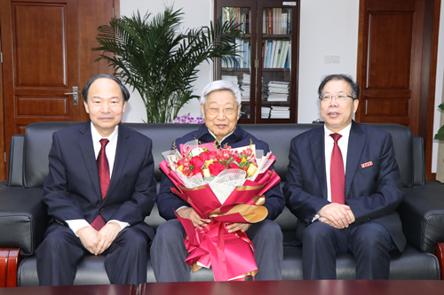 5月19日,在刘秀梵院士80周岁生日之际,校党委书记姚冠新、校长焦新安来到文汇路校区亲切看望刘秀梵院士,祝福他生日快乐。