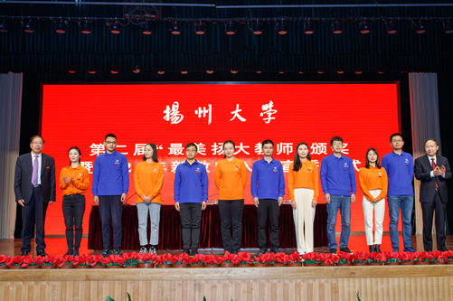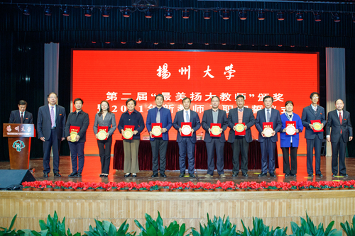 在“最美扬大教师”颁奖仪式上,姚冠新、焦新安为第二届“最美扬大教师”及提名奖代表颁发奖牌及证书,新入职教师代表为第二届“最美扬大教师”及提名奖代表送上鲜花和祝福。