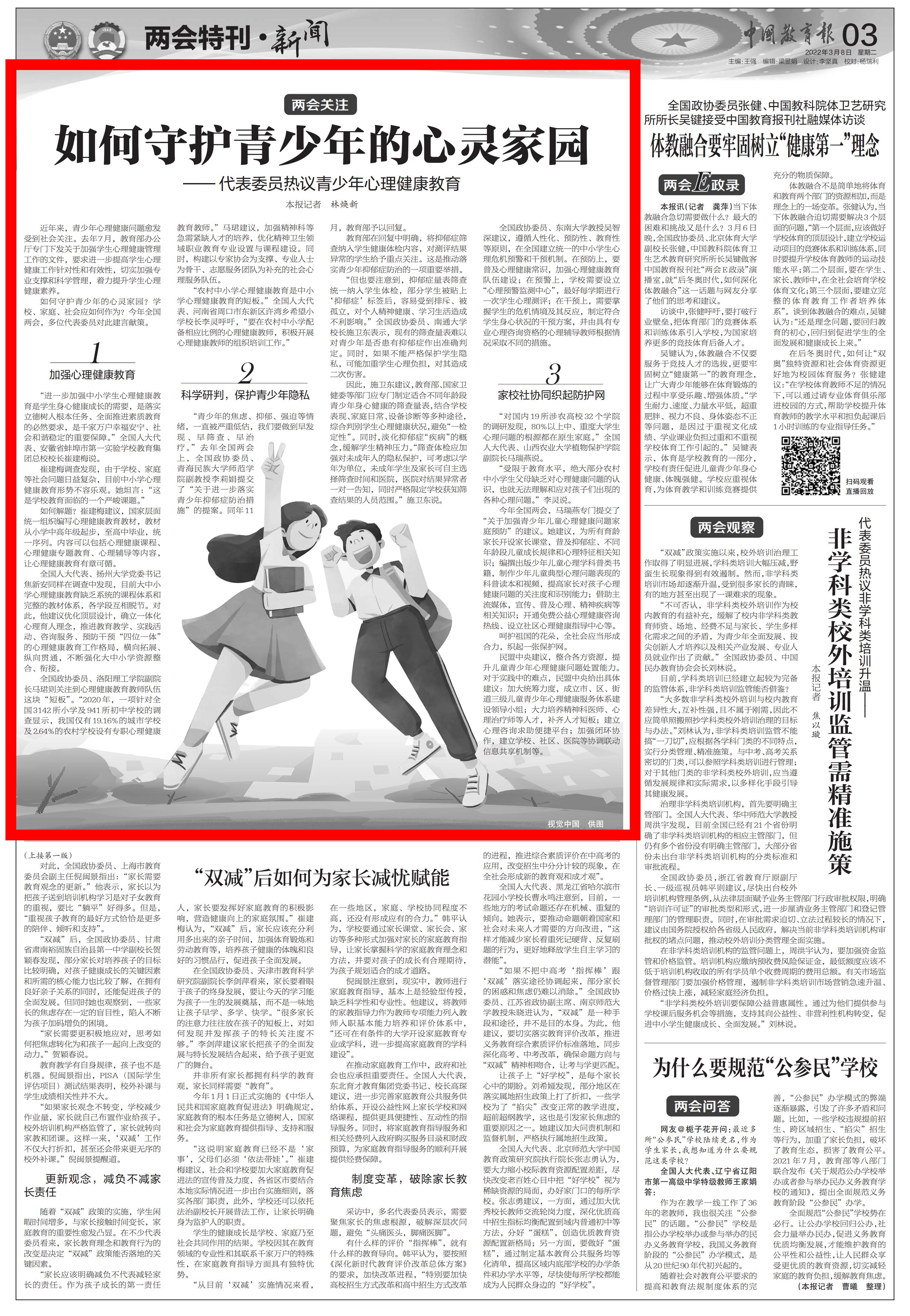 如何守护青少年的心灵家园?学校、家庭、社会应如何作为?今年全国两会,多位代表委员对此建言献策。