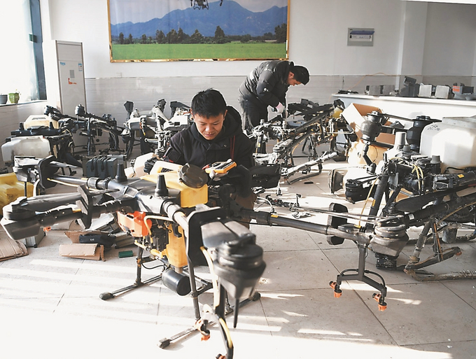 16日,淮安市洪泽区朱坝街道一家维修公司技术人员利用农闲时间维修保养农用无人机,助力春耕生产。王生标 摄 (视觉江苏网供图)