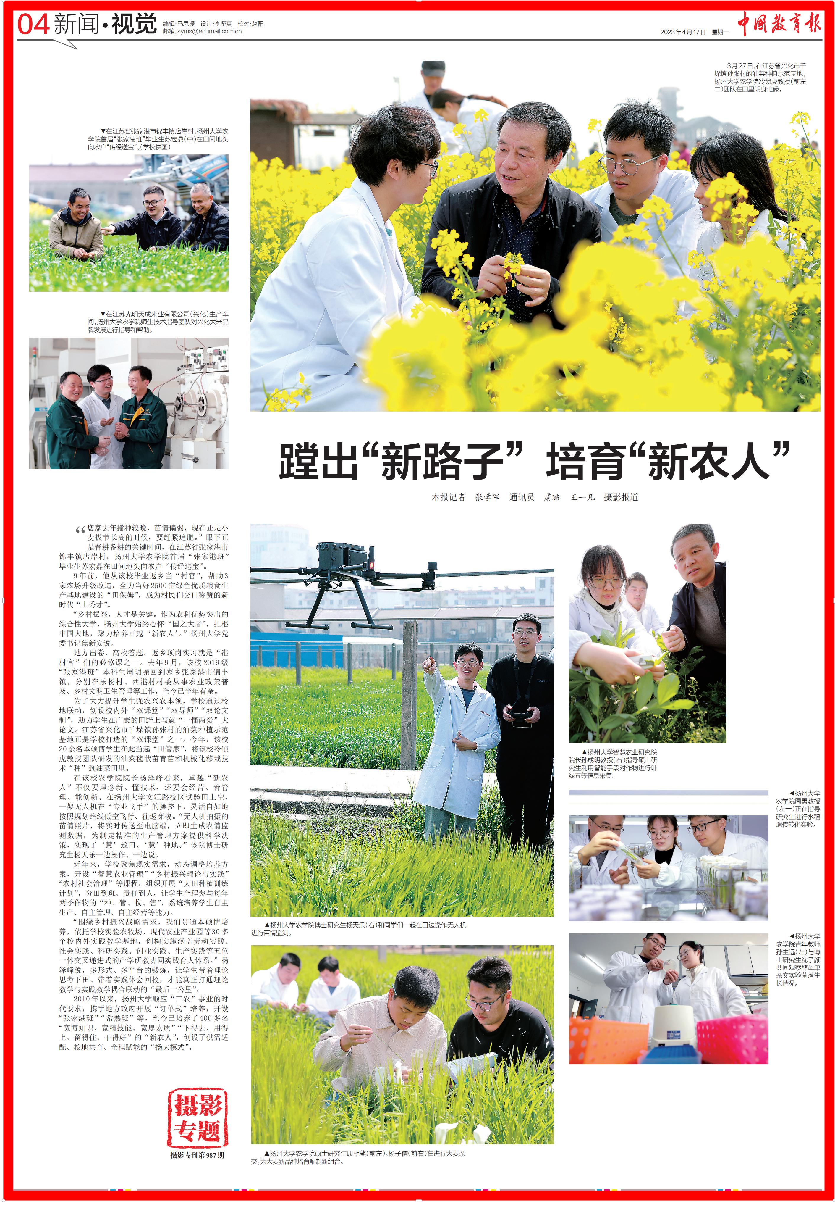 “乡村振兴,人才是关键。作为农科优势突出的综合性大学,扬州大学始终心怀‘国之大者’,扎根中国大地,聚力培养卓越‘新农人’。”扬州大学党委书记焦新安说。