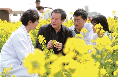 3月27日,在江苏省兴化市千垛镇孙张村的油菜种植示范基地,扬州大学农学院冷锁虎教授(前左二)团队在田里躬身忙碌。