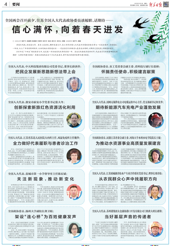 过去一年,我走访调研了多省的医疗机构,调研笔记上也写满了来自基层一线的民生期盼。从扬州“中国医疗器械耗材之乡”头桥镇到苏州高新区,我了解到企业智能技术发展和市场需求,为大学生就业和专业调整提供了科学依据。在天津大学、广州生物中心等科研机构,我走访考察了医疗技术的最新发展动向,积极促成抑郁症治疗技术在扬州落地应用。今年全国两会,我将带着“提高国家级中医药非遗项目丰度筑牢文化强国建设资源根基”“优化药品说明书,推进适老化改造”等提案赴会,继续为群众福祉、百姓健康发声。