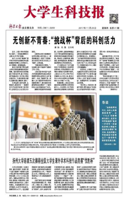 【大学生科技报头版】扬州大学连续五次捧得全国大学生课外学术科技作品竞赛“优胜杯”