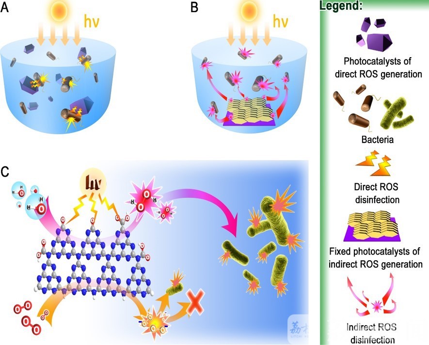 当g-C3N4受到可见光激发产生电子(e-)-空穴(h+)对,电子与材料表面的氧气结合生成超氧自由基,进一步的生成强氧化性的羟基自由基。这两种自由基均具有较强的氧化能力,从而达到破坏细菌的细胞壁彻底杀灭细菌的效果。
