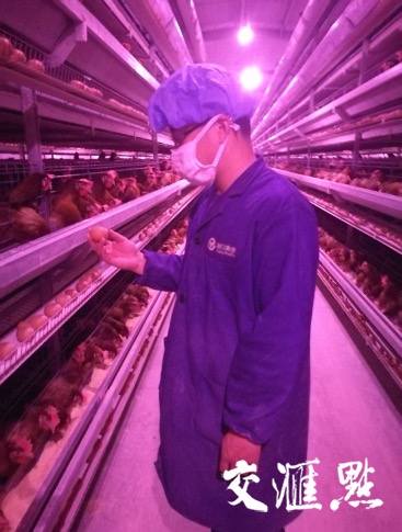 扬大动物科学与技术学院学生周楷智在盐城军曼农业科技有限公司实习中检查蛋壳品质。