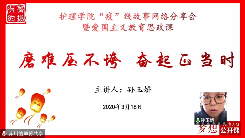 这场特别的分享会通过网络连线进行线上直播,主讲人是江苏省第三批援鄂医疗队成员、南京鼓楼医院护士孙玉娇。课堂上,孙玉娇结合自身的战“疫”一线的感受,与同学们分享了她在疫情期间对于“职业”“学习”“集体”和“生活”的理解和感悟。她说,我们对中国在疫情中的担当感到骄傲自豪,党和政府果断的防疫措施迅速控制了疫情的传播速度,在公共卫生防疫工作方面,为世界做出了巨大的贡献。