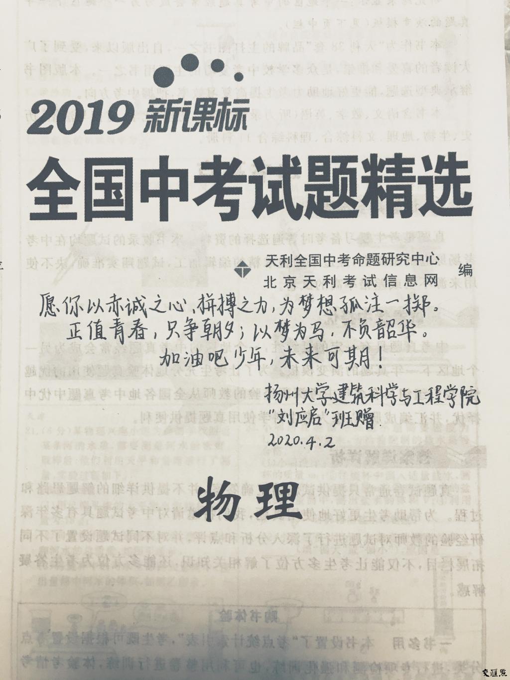 “愿你以赤诚之心、拼搏之力,为梦想孤注一掷。正值青春,只争朝夕;以梦为马,不负韶华。加油吧少年,未来可期!”当翻开《中考物理试题精选》,看到扉页寄语时,嘉嘉备受鼓舞。这是扬州大学建筑科学与工程学院“刘应启班”全体同学对嘉嘉的诚挚祝愿。“刘应启班”是扬州大学建工学院以扬州百岁老红军刘应启的名字命名的班级,工管1701班、1702班已是第二届。嘉嘉与扬州大学“刘应启班”结缘可以追溯到2019年7月扬州大学“微行筑梦”支教团的贵州之行,2019年8月初的一个清晨,嘉嘉送别“微行筑梦”支教团时,递给“刘应启班”徐思蝶一张精心制作的贺卡,那张贺卡不是一份告别,而是山海情谊的展开。
