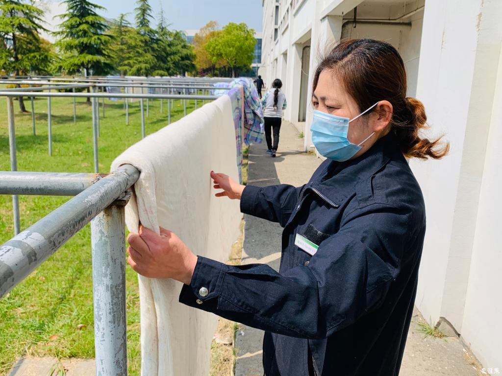 4月13日上午,扬州大学的校园里阳光明媚,该校扬子津东校区的宿管阿姨们一大早就纷纷出动,为4000多床被子做了一次“日光spa”。