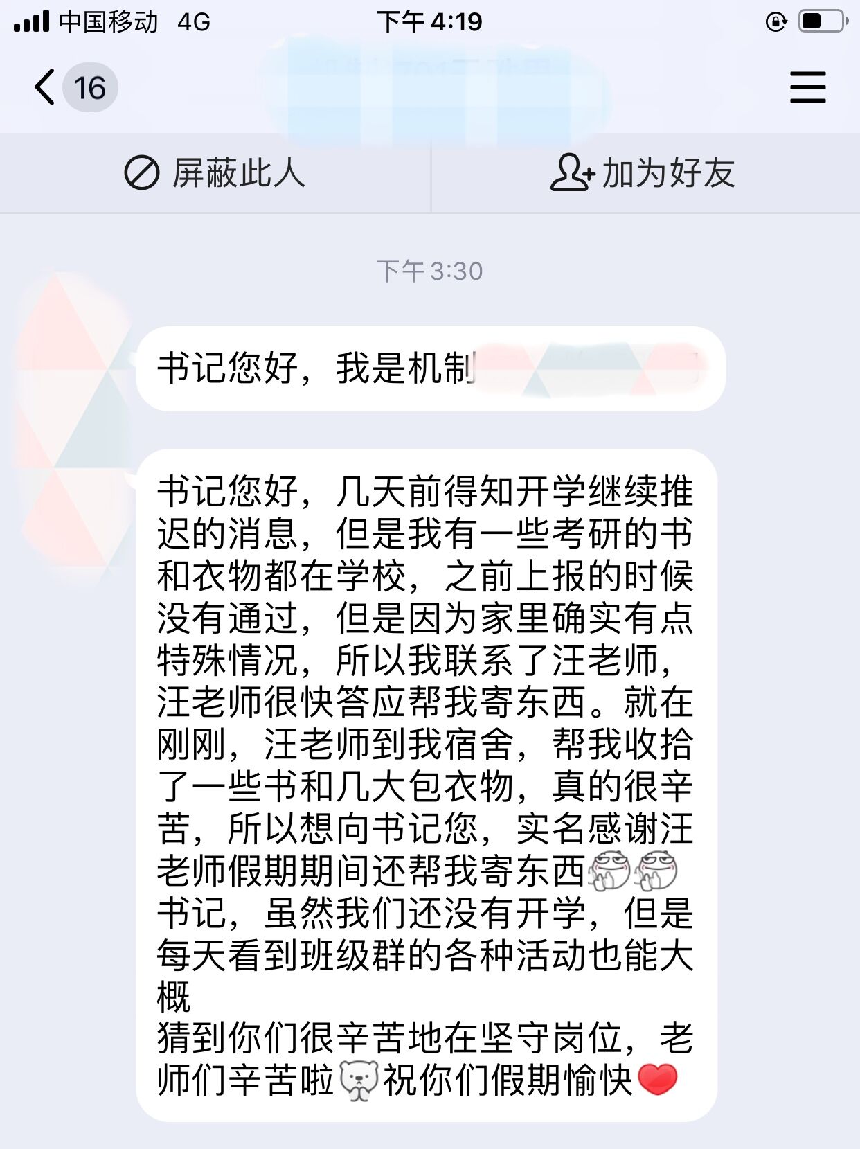 5月2日,院团委副书记汪志国拿着满满三页纸的清单,找来了快递车,到宿舍区和同学们视频连线,帮学生仔细打包、寄送物品。“由于学习方式的转变,我需要电脑来辅助学习、获取信息,居家考研,更是对自我学习能力的一次考验,不能辜负学院老师的一片苦心。”“实名点赞汪老师,假期还帮我寄东西,看到寄送物品汇总表内密密麻麻的文字,辅导员们的努力可想而知,愿他们假期愉快!”“下单”的同学们给老师发来了暖心的感谢短信。
