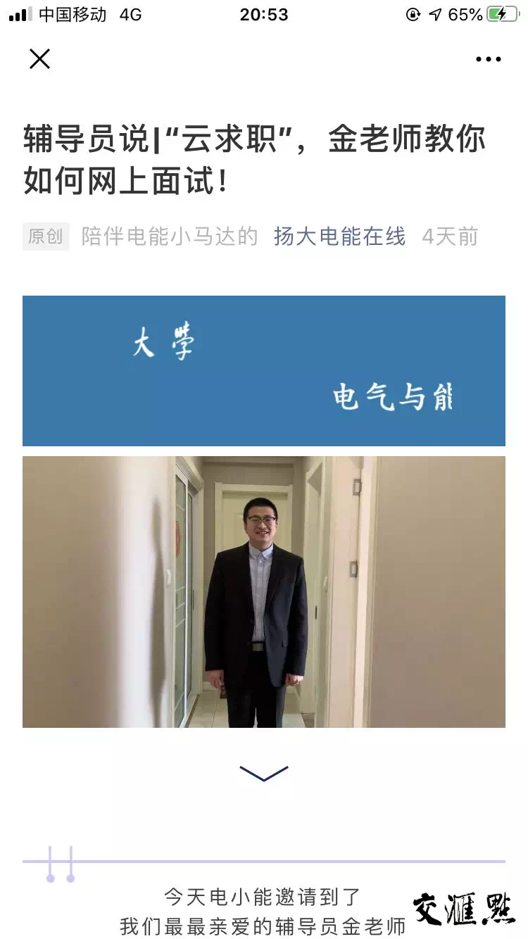 在刚刚结束的网络面试中,来自扬州大学电气与能源动力工程学院电气1602班的姜屿同学成功应聘上了上海电气集团自动化工程有限公司,他表示,学院微信公众号“辅导员说”专栏推送的“云求职”网络面试技巧相当实用,给他带来了很大的帮助。