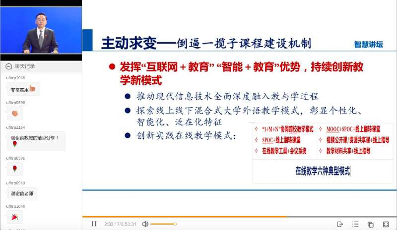 记者了解到,讲坛邀请了教育部高等学校外国语言文学类专业教学指导委员会和教育部高等学校大学外语教学指导委员会有关专家,分析国内外形势与教育发展趋势,探讨当前高校外语教育的重点任务。当天的报告中,俞洪亮指出,中国大学MOOC爱课程、外语类出版社网络教学平台和校本教学平台的前期建设,为此次疫情期间各高校的在线教学提供了有力的技术和丰富的教学资源支持。目前全国各高校线上教学已趋于常态,学校进入正常管理,但在线教学还存在一定问题,如:线上教学所需要的设备、网络、平台等技术问题;教师的信息化素养和能力以及学生的参与度、教学质量检测与评估等方面均存在障碍。