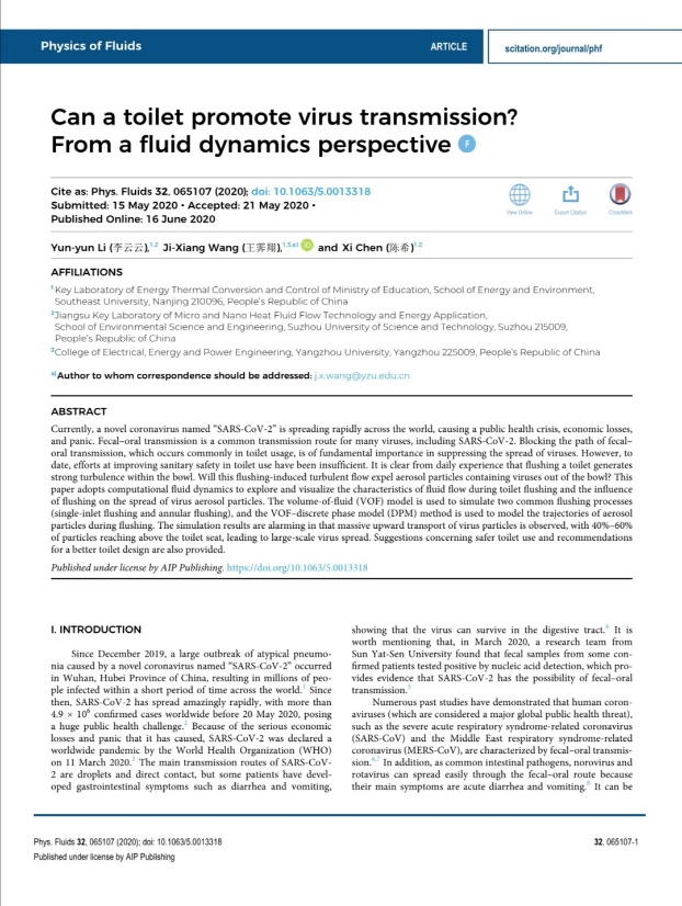 【中国科技网】冲马桶升腾的水雾可传播病毒,该怎样防护感染? 日前,国际权威期刊《流体物理学(Physics of Fluids)》在线发表了扬州大学电气与能源动力工程学院微尺度流动传热与能源高效利用科研团队的一项研究成果。该论文中提出,如果冲马桶时不合盖,冲水过程中产生的水雾会将粪便中的病毒抬升至头部高度,从而可能让人吸入水雾中的病毒,致使感染。