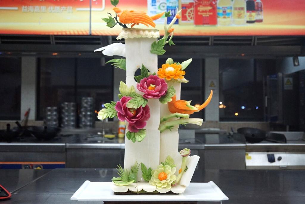 冷拼是由一般冷菜拼盘逐渐发展而成的,起源于中国,是源远流长的中华饮食文化孕育的一颗璀璨明珠。邢阿强将具有悠久历史的冷拼与现代化元素相结合,一刀一钳制作出“火箭”“国旗”“和平鸽”等标志性物品,借此为祖国庆贺七十一岁生日。