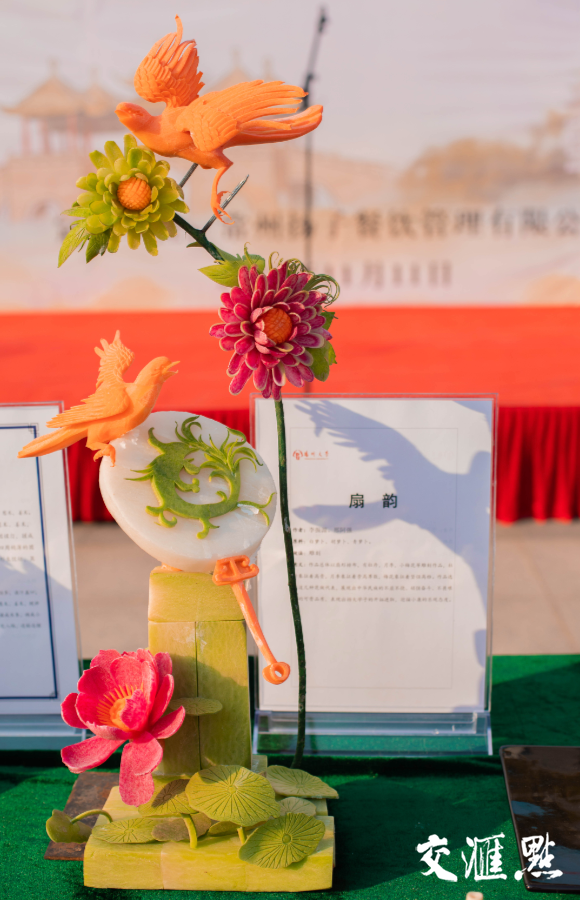 “‘花开富贵’这道菜外形是一朵菊花托举着一颗明珠,旁边有一个可爱的蜗牛。这既有我们对扬州作为世界美食之都未来走向繁荣的愿景,又十分照应现在秋天菊花盛开的景色。菊花的角度和花瓣的层次都是重复了很多次才有今天展示的效果。”烹饪1902班的徐绍洋同学向记者介绍道。