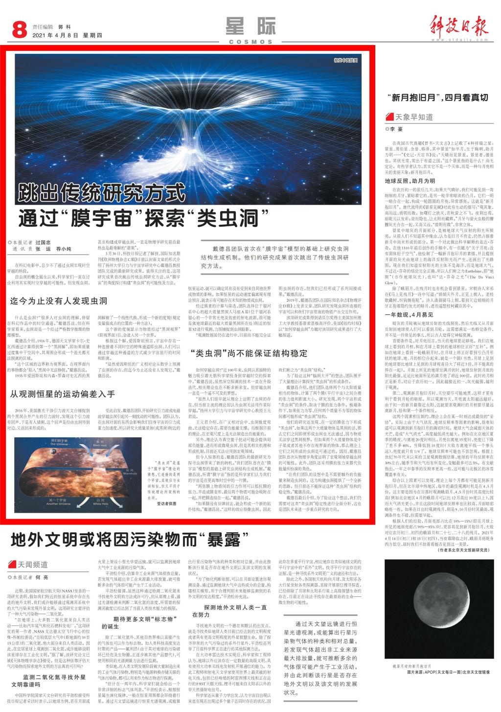 3月30日,科技日报记者了解到,国际知名期刊《欧洲物理杂志C辑》日前以封面文章的形式介绍了扬州大学引力与宇宙学研究中心戴德昌教授团队完成的最新研究成果。值得关注的是,这项研究成果首次跳出传统虫洞研究方法,从“膜宇宙”的角度探讨构建“类虫洞”的可能性及方法。