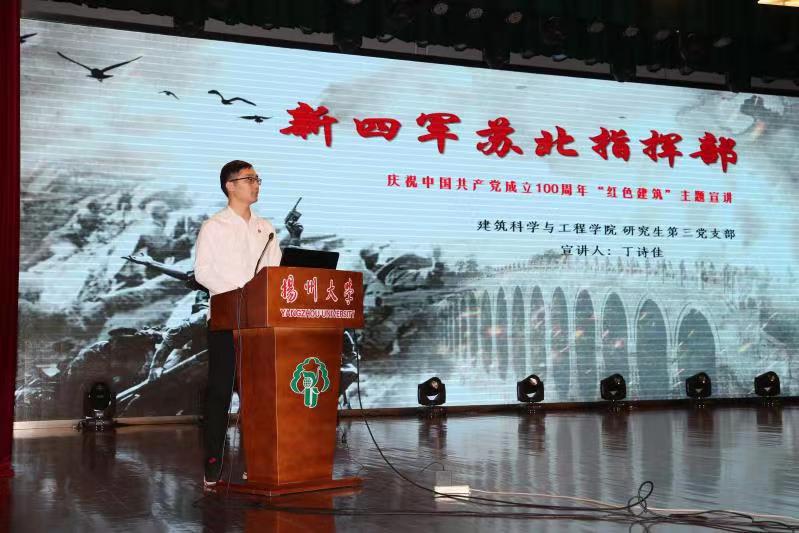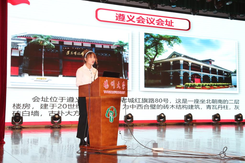 7名宣讲团成员围绕中共一大会议、遵义会议会址、泸定桥、新四军苏北指挥部旧址于氏姊妹楼、中国海军诞生地白马庙、南京江宁“仲铭亭”、江上青烈士史料陈列馆等蕴含丰富红色文化底蕴的“红色建筑”,生动讲述了一个个感人至深的党史故事,为扬州大学600多名师生上了一堂生动的党史课。
