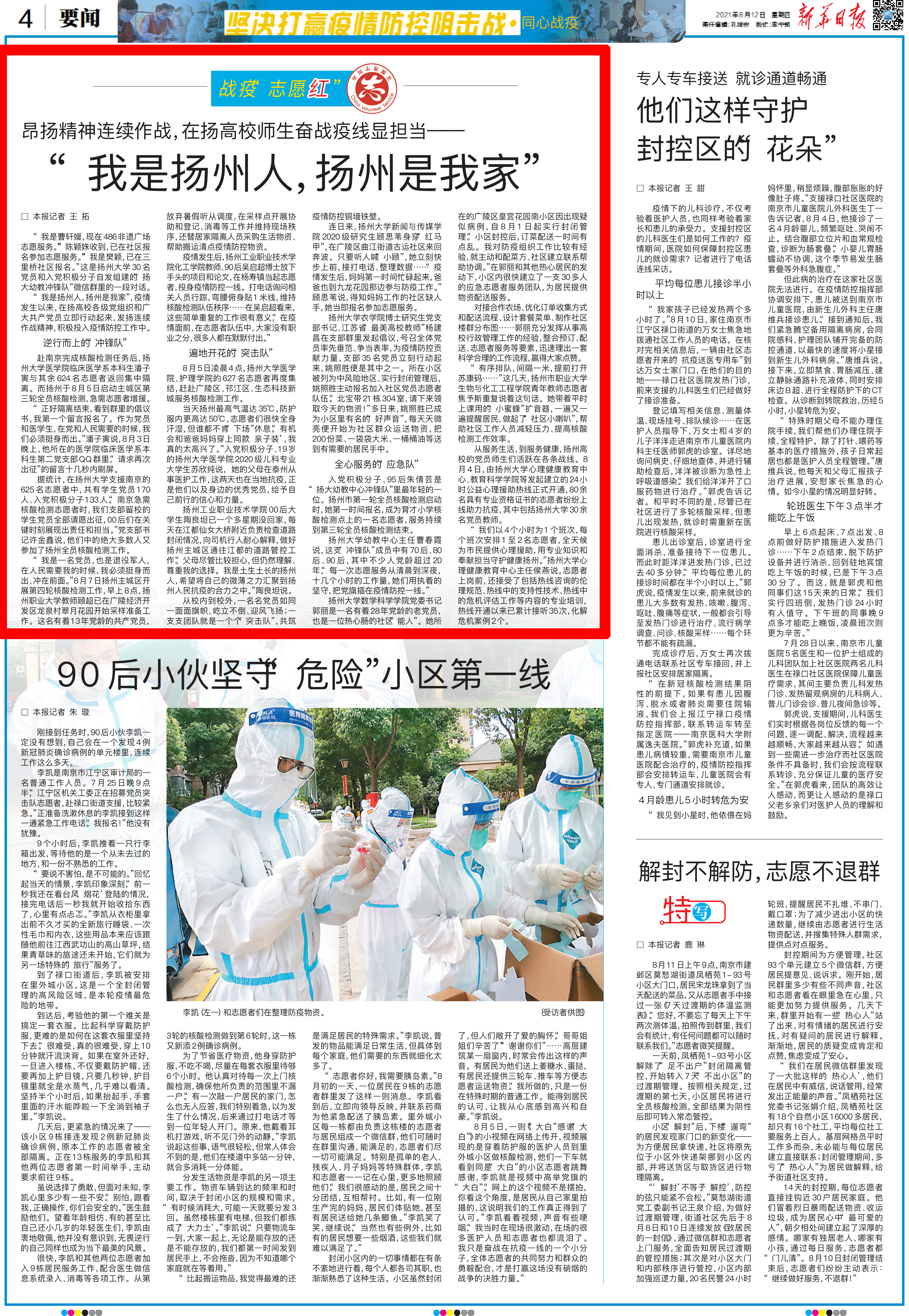 疫情发生后,扬州工业职业技术学院化工学院教师、90后吴启超博士放下手头的项目和论文,在杨寿镇当起志愿者,投身疫情防控一线。打电话询问相关人员行踪,弯腰俯身贴1米线,维持核酸检测队伍秩序……在吴启超看来,这些简单重复的工作很有意义,“在疫情面前,在志愿者队伍中,大家没有职业之分,很多人都在默默付出。”