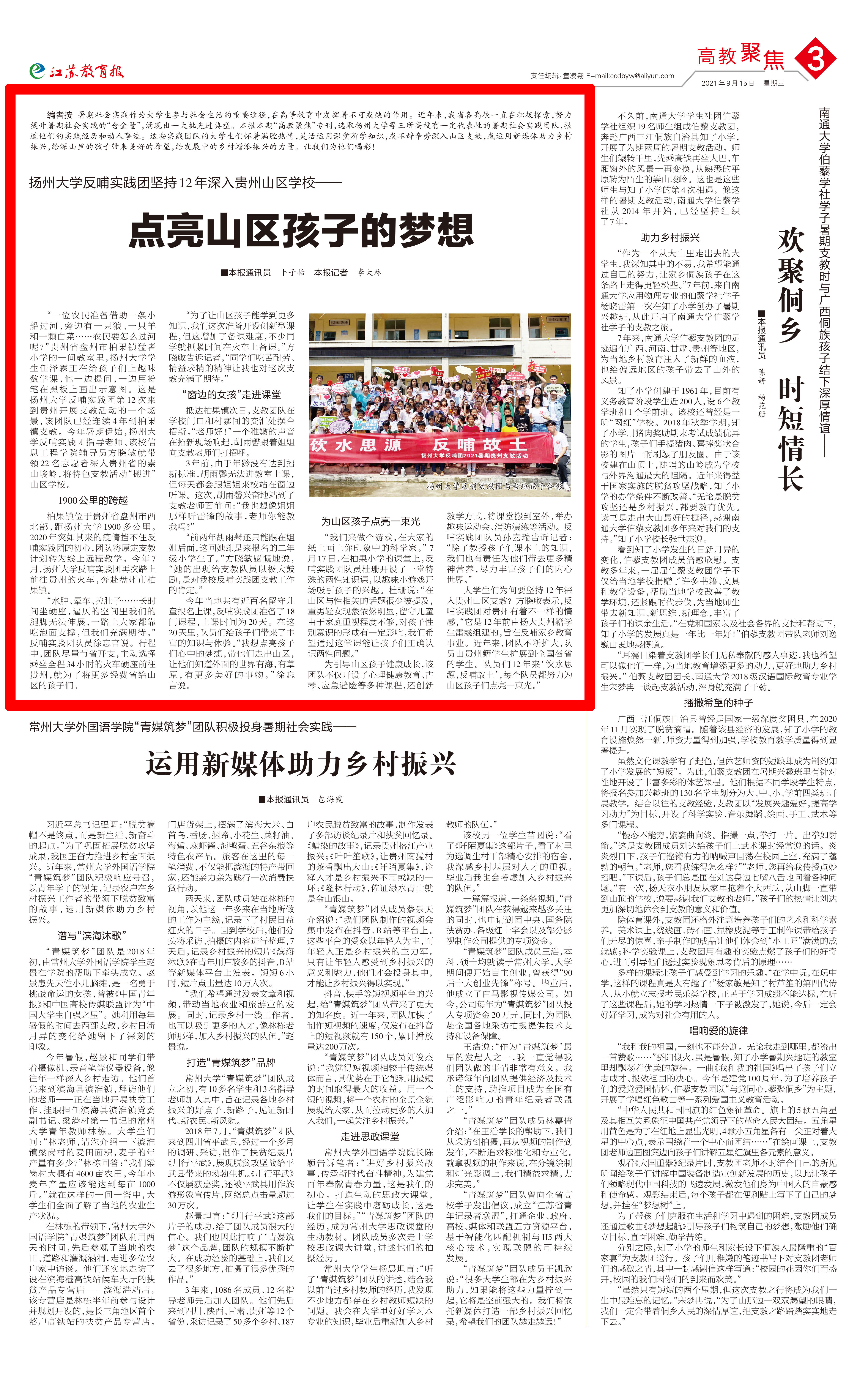 编者按暑期社会实践作为大学生参与社会生活的重要途径,在高等教育中发挥着不可或缺的作用。近年来,我省各高校一直在积极探索,努力提升暑期社会实践的“含金量”,涌现出一大批先进典型。本报本期“高教聚焦”专刊,选取扬州大学等三所高校有一定代表性的暑期社会实践团队,报道他们的实践经历和动人事迹。这些实践团队的大学生们怀着满腔热情,灵活运用课堂所学知识,或不辞辛劳深入山区支教,或运用新媒体助力乡村振兴,给深山里的孩子带来美好的希望,给发展中的乡村增添振兴的力量。让我们为他们喝彩!