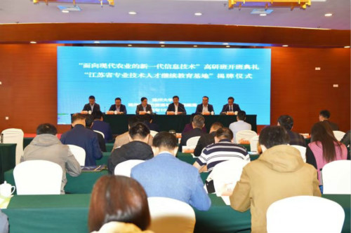 国家人社部“面向现代农业的新一代信息技术”高级研修班在我校开班10月25日,国家人社部“面向现代农业的新一代信息技术”高级研修班开班典礼暨“江苏省专业技术人才继续教育基地”揭牌仪式在我校举行。副校长刘巧泉、江苏省人力资源和社会保障厅专业技术管理处处长张志远出席开班典礼,并共同为基地揭牌。