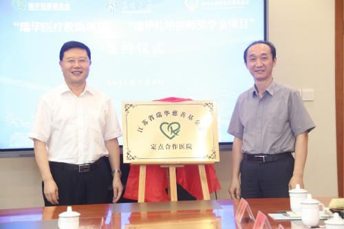 仪式上,三方共同签署捐赠项目合作协议并为“江苏省瑞华慈善基金会定点医院”揭牌。陈耀向江苏省瑞华慈善基金会颁发捐赠荣誉证书。
