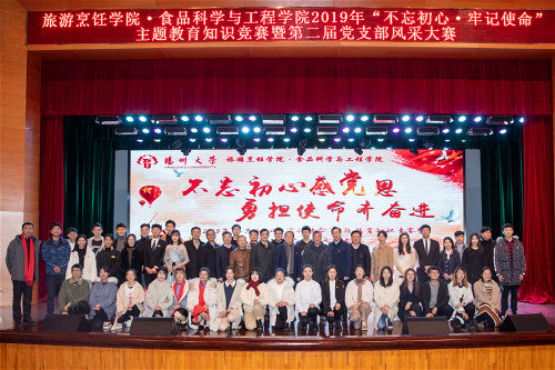旅烹学院举办2019年“不忘初心、牢记使命”主题教育知识竞赛暨第二届党支部风采大赛 12月18日,旅游烹饪学院•食品科学与工程学院在扬子津校区文体馆剧场举行2019年“不忘初心、牢记使命”主题教育知识竞赛暨第二届“不忘初心感党恩,勇担使命共奋进”党支部风采大赛。
